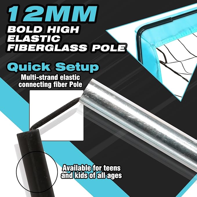 - THICK FIBERGLASS POLES: The soccer goal with 12 mm high-elastic fiberglass poles,its elasticity effect is 1.3 times that of ordinary fiberglass poles, and it can perform well even in the face of powerful shots.