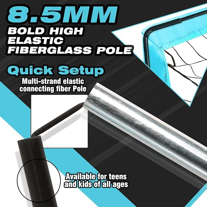- THICK FIBERGLASS POLES: The soccer goal with 8.5 mm high-elastic fiberglass poles,its elasticity effect is 1.3 times that of ordinary fiberglass poles, and it can perform well even in the face of powerful shots.