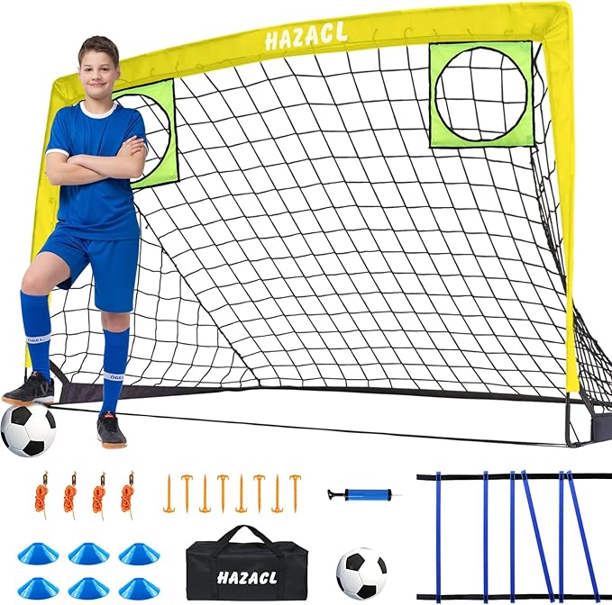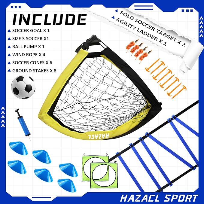 - 【Complete Gift Set】 This is a complete youth soccer goal training equipment set, including 1 x soccer net, 1 x size 3 soccer ball, 1 x agility ladder, 6 x agility cones, 2 x target, 8 x ground stakes, 4 x wind ropes, 1 x air pump and 1 x storage bag. Meet kids' soccer practice and indoor or outdoor game needs.