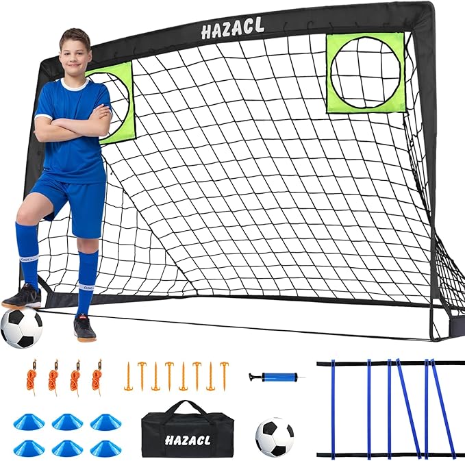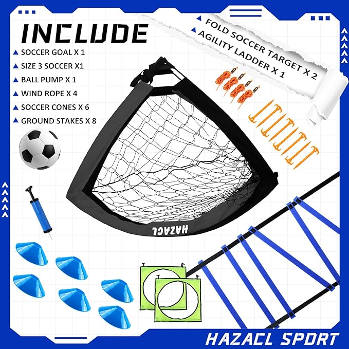 - 【Complete Gift Set】 This is a complete youth soccer goal training equipment set, including 1 x soccer net, 1 x size 3 soccer ball, 1 x agility ladder, 6 x agility cones, 2 x target, 8 x ground stakes, 4 x wind ropes, 1 x air pump and 1 x storage bag. Meet kids' soccer practice and indoor or outdoor game needs.