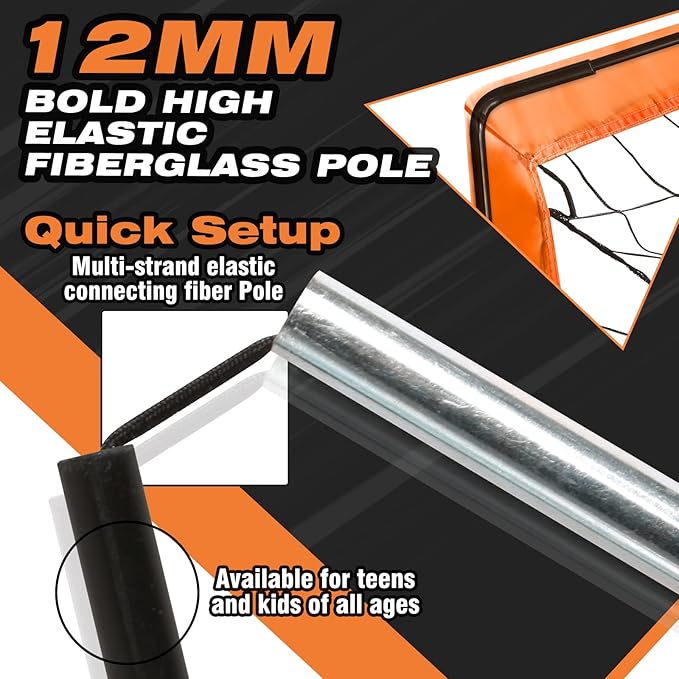 - THICK FIBERGLASS POLES: The soccer goal with 12 mm high-elastic fiberglass poles,its elasticity effect is 1.3 times that of ordinary fiberglass poles, and it can perform well even in the face of powerful shots.