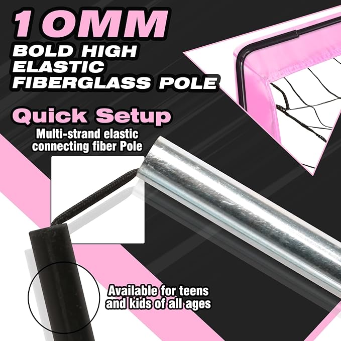- THICK FIBERGLASS POLES: The soccer goal with 10 mm high-elastic fiberglass poles,its elasticity effect is 1.3 times that of ordinary fiberglass poles, and it can perform well even in the face of powerful shots.