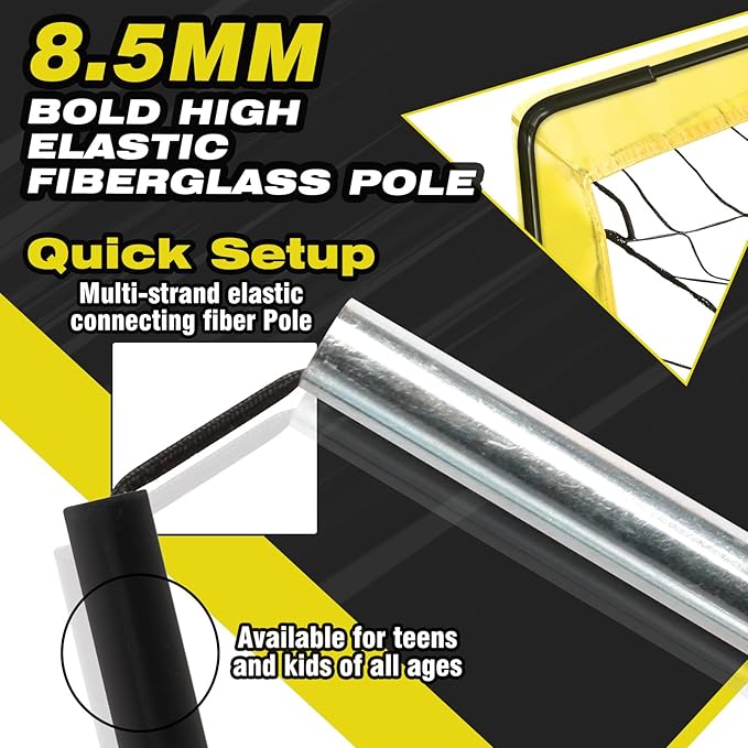 - THICK FIBERGLASS POLES: The soccer goal with 8.5 mm high-elastic fiberglass poles,its elasticity effect is 1.3 times that of ordinary fiberglass poles, and it can perform well even in the face of powerful shots.