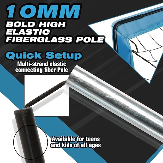 - THICK FIBERGLASS POLES: The soccer goal with 10 mm high-elastic fiberglass poles,its elasticity effect is 1.3 times that of ordinary fiberglass poles, and it can perform well even in the face of powerful shots.