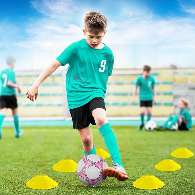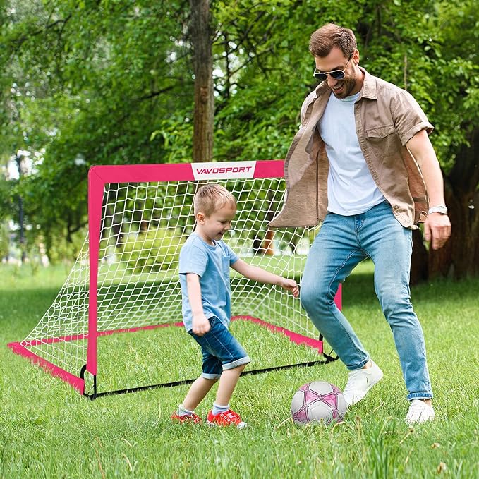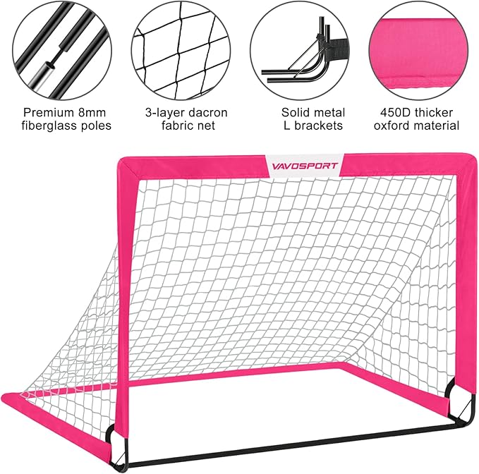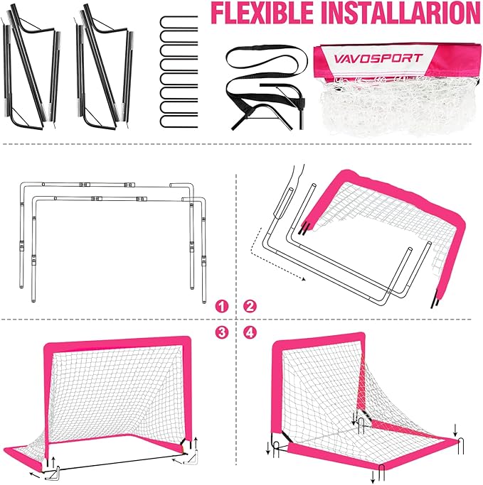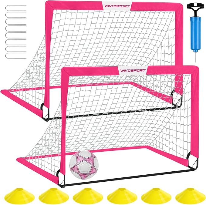- Complete and Valuable Soccer Goals Set - The VAVOSPORT Soccer Net Set is the most complete soccer set on the market. It has 2 easy-fold kids' soccer goals, 1 std size 3 soccer ball, 1 inflation pump, 6 cones, 8 U-shaped heavy-duty ground nails and 1 carrying bag. One soccer set for everything you need to develop your child into a little athlete, allowing your kids to have their "own" net to score a goal on!