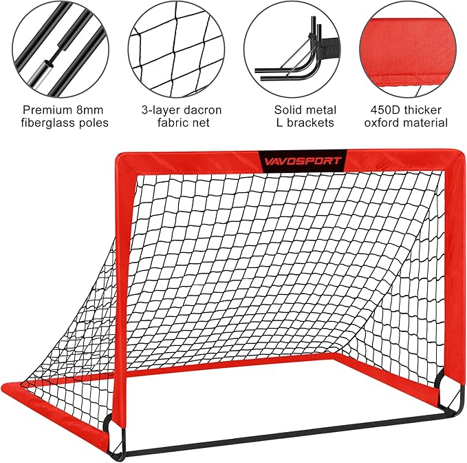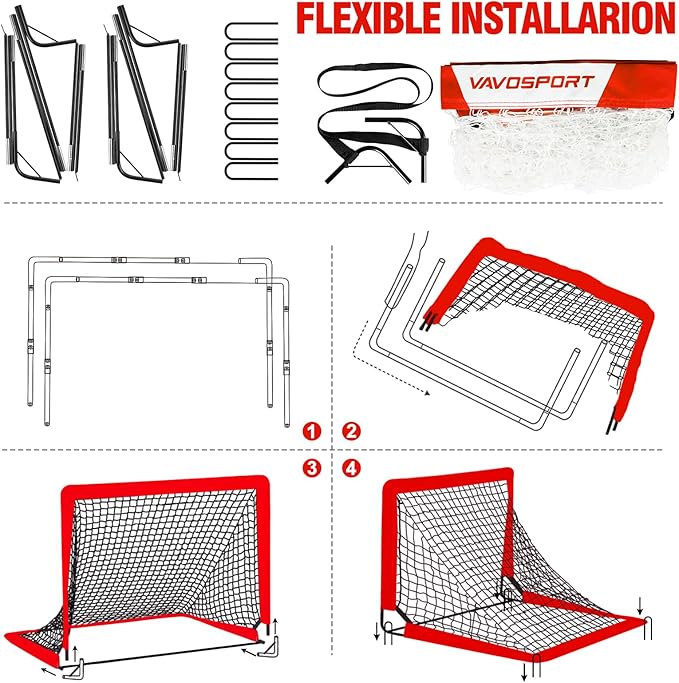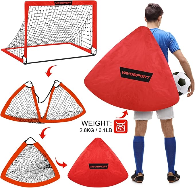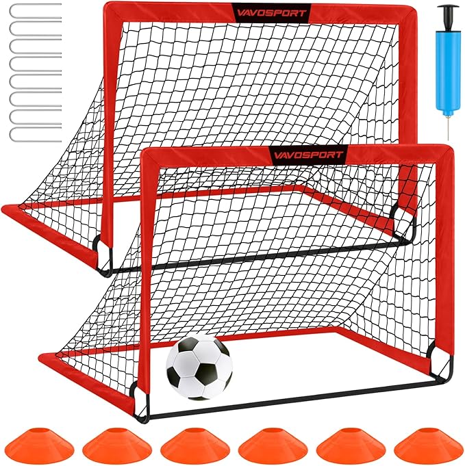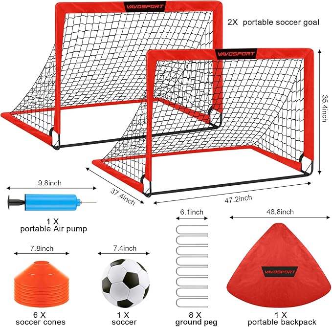 - Complete and Valuable Soccer Goals Set - The VAVOSPORT Soccer Net Set is the most complete soccer set on the market. It has 2 easy-fold kids' soccer goals, 1 std size 3 soccer ball, 1 inflation pump, 6 cones, 8 U-shaped heavy-duty ground nails and 1 carrying bag. One soccer set for everything you need to develop your child into a little athlete, allowing your kids to have their "own" net to score a goal on!