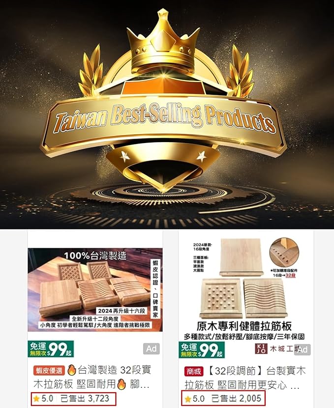 - More than 10,000 sets have been sold in Taiwan. Our Wooden Stretching Board awarded the top ten commemorative labels in Taichung, Taiwan, and obtained Taiwan patent certificate, certificate number D220706.