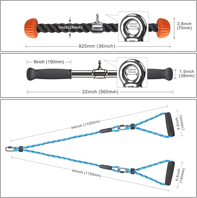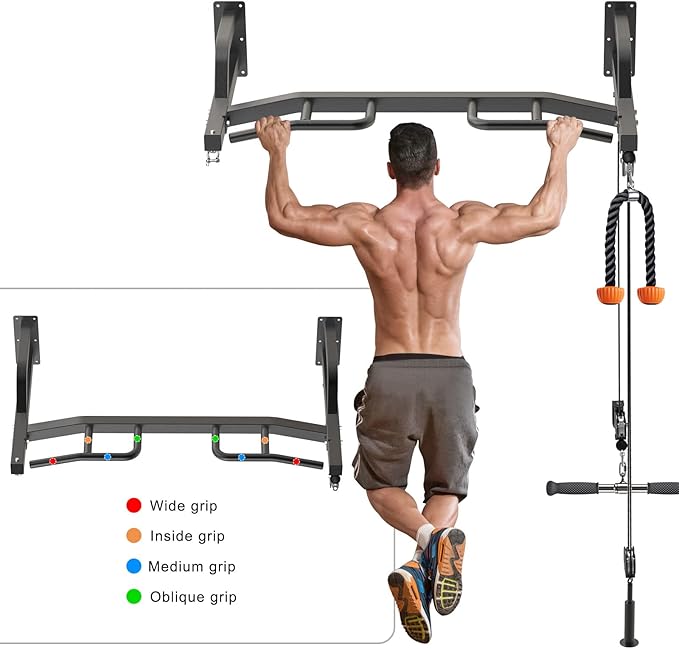 - 【Multifunctional Fitness Equipment】Our wall mounted cable machine can help you perform various exercises to train your upper body, lower body and core muscles. It comes with a tricep rope, a pull down rope and a straight bar, which can be used for different LAT cable attachments. It can also be used as a pull-up bar and a punching bag hanger.