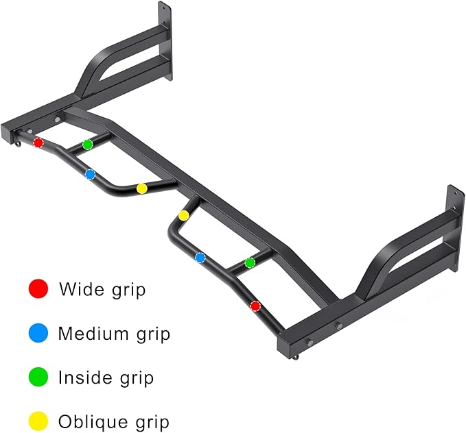 • 💪Achieve Your Fitness Goals: Whether you want to build muscle, burn fat, or improve your health, our wall mounted pull up bar can help you get there. With 12 different grip positions, you can perform various exercises such as pull ups, chin ups, dips, leg raises, and more. You can work on different muscle groups such as your back, chest, arms, shoulders, abs, and core with one simple device.