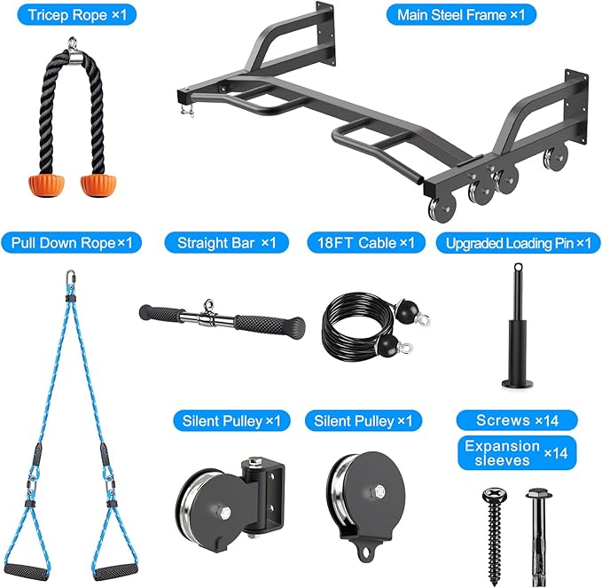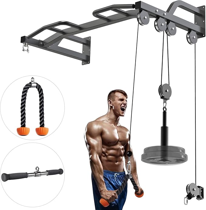 • 【Multifunctional Fitness Equipment】Our wall mounted cable machine can help you perform various exercises to train your upper body, lower body and core muscles. It comes with a tricep rope, a pull down rope and a straight bar, which can be used for different LAT cable attachments. It can also be used as a pull-up bar and a punching bag hanger.