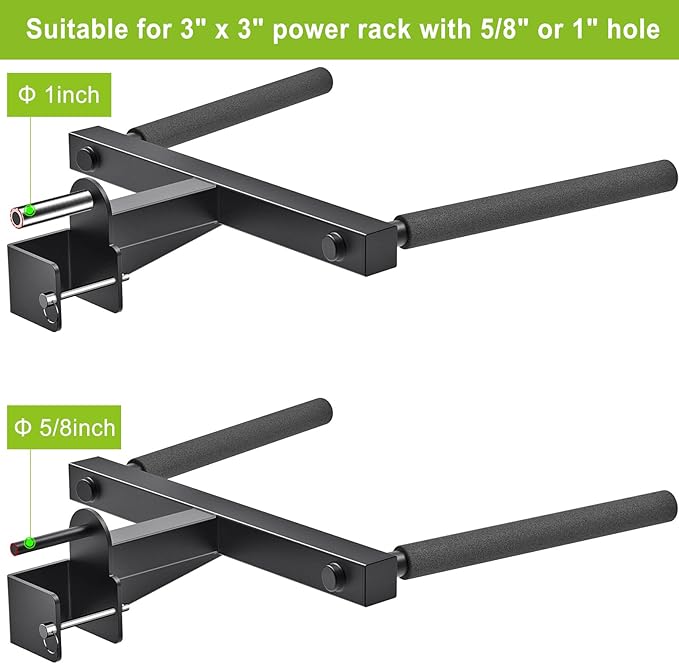 - 【Compatibility】The Y-Bar Dip Station Handles are compatible with 3"x3" steel tube power racks that have 5/8" or 1" holes. Please measure your power rack size before buying to ensure a proper fit.