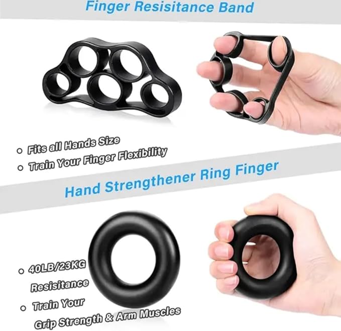 - 🖐️【【GRIP STRENGTHENER TRAINER KITS OF 5】The Grip Strengthener Trainer sets include an adjustable hand gripper (11-132Lbs), finger exerciser (4Lbs on each finger), hand strengthener grip ring (50Lbs), stress relief grip ball, and finger stretchers with varying resistance levels (6.6Lbs, 8.8Lbs, and 11Lbs). This kit offers a variety of exercises to target different muscle groups and meet the needs of different fitness levels.
