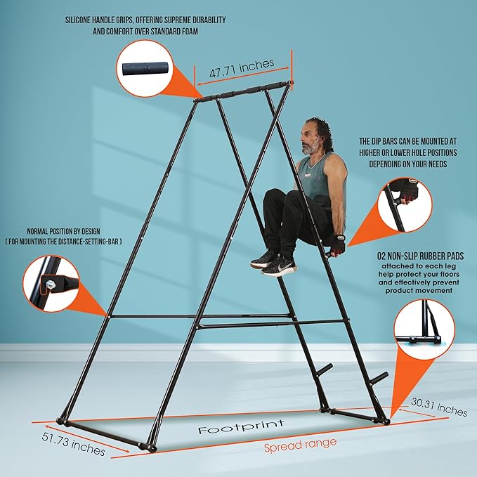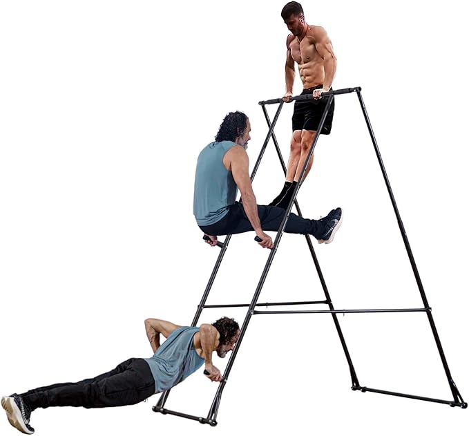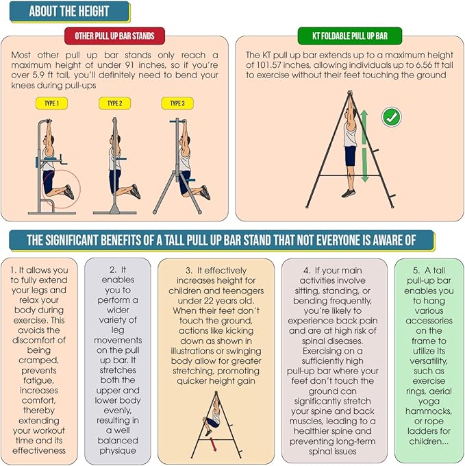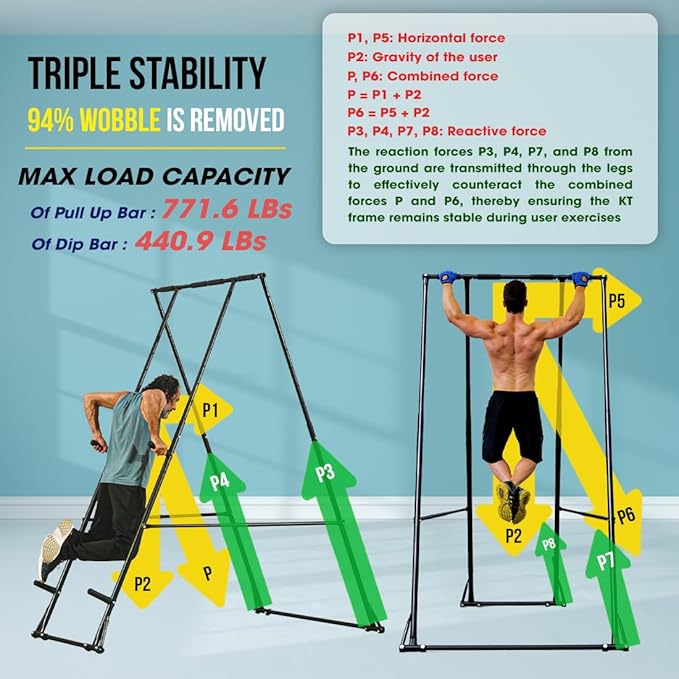- [Amazing Workout Experience] Rising above competitors, the KT Folding Pullup Dip Stand accommodates both basic and advanced exercises, including muscle-ups and kipping pull-ups. Engineered for quad-directional stability and boasting a superior 771.6 lbs capacity, it ensures safe, effective, and comfortable workouts. Its remarkable 101.57'' max height and enhanced sturdiness eliminate 94% of wobble, providing an unparalleled high-quality pull-up/chin-up experience with full-body stretching