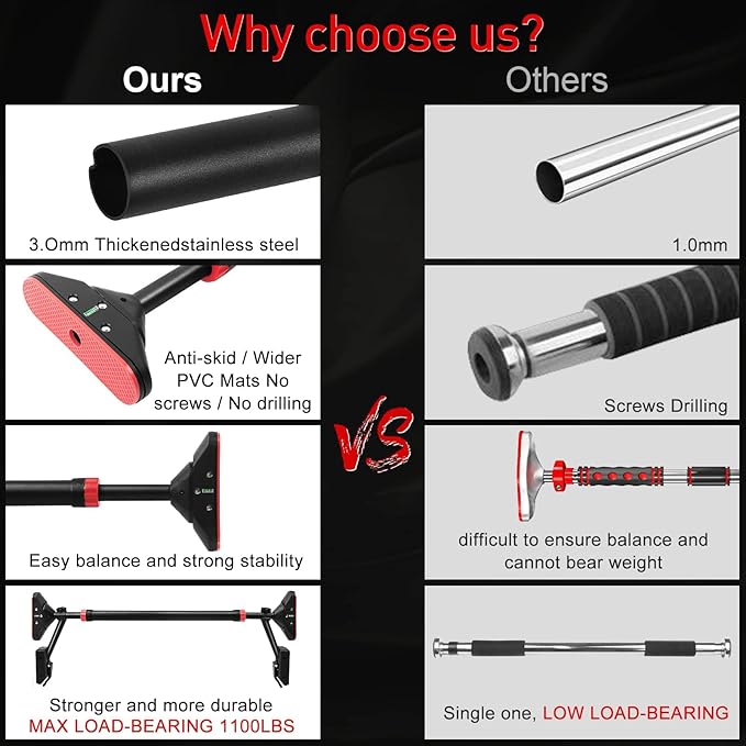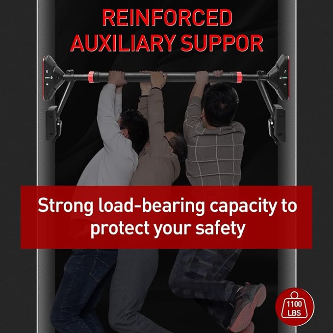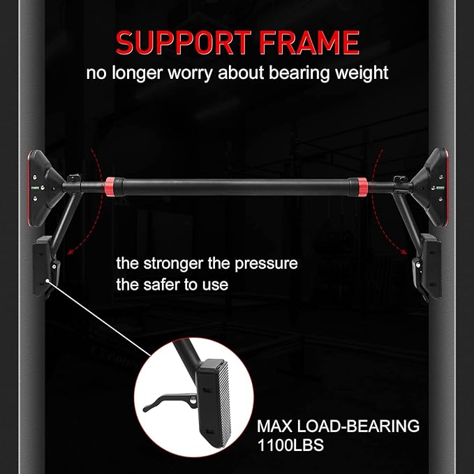 • 【Support Frame Design!】This is an amazing new design, which greatly strengthens the load-bearing capacity of the pull up bar, so that you can be more involved and more at ease when exercising! When mounted properly, this fitness bar can hold up to 1100lbs(500kg), giving you full support for pull ups and chin ups.
