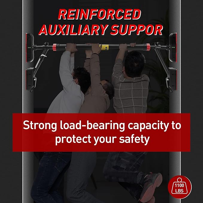 - 【Support Frame Design!】This is an amazing new design, which greatly strengthens the load-bearing capacity of the pull up bar, so that you can be more involved and more at ease when exercising! When mounted properly, this fitness bar can hold up to 1100lbs(500kg), giving you full support for pull ups and chin ups.
