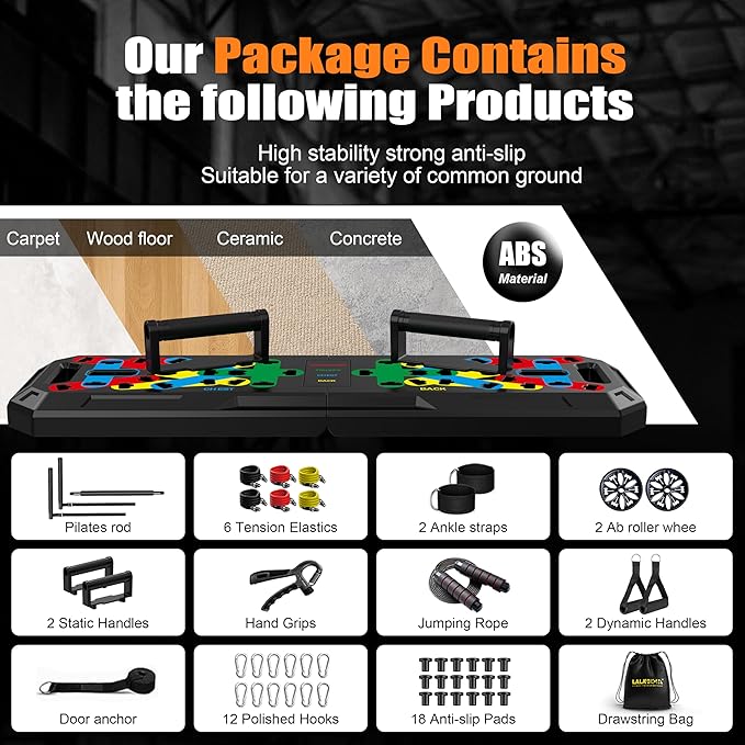 • Multi-functional Training: The multi-functional training board features an upgraded design and color-coded guide. Targeting different muscle groups (chest, shoulders, abs, biceps, back), the LALAHIGH push-up board combined with resistance bands with bar, Pilates bar, and pulley offers various training positions, allowing for more push-up angles and workout variations.