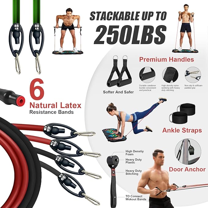 • Professional Workout Kit: Elevate your fitness game at home with a color-coded pushup board and resistance bands set. Versatile workouts for strength, resistance, and cardio—all in one kit.