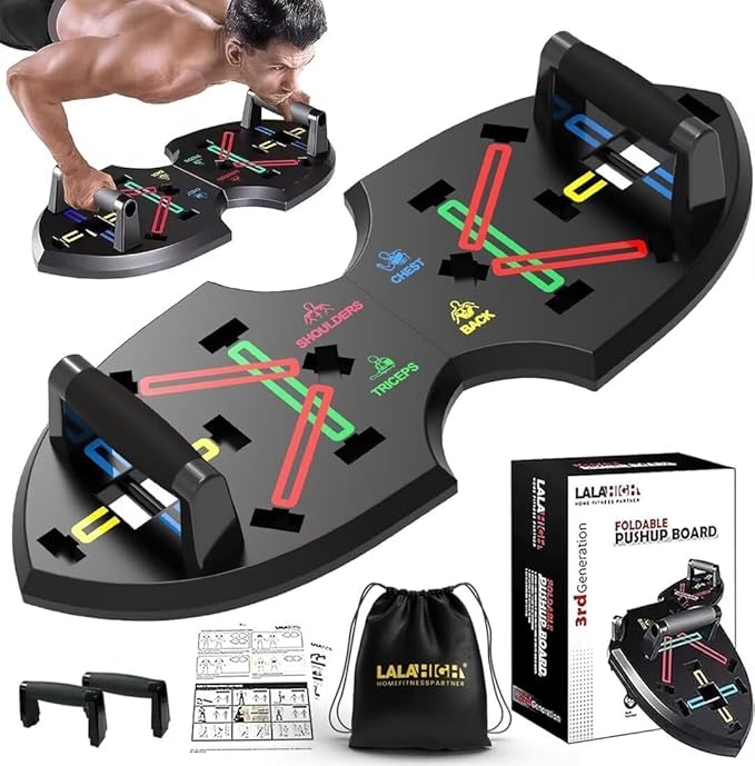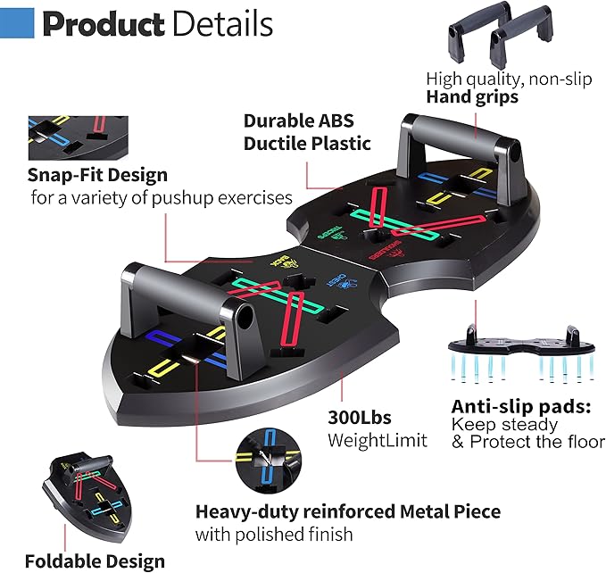 - MULTIPURPOSE HOME GYM:This Foldable Pushup Board is color-coded in order to provide multiple highly effective pushup postures. Our at-home workout equipment is specifically designed to target different muscle groups (chest, shoulder, triceps, biceps, and back), while engaging your core. Scientifically proven to activate 30% to 50% more muscle growth. Detailed instructions are provided with professional training guidance for maximizing your full body work out.