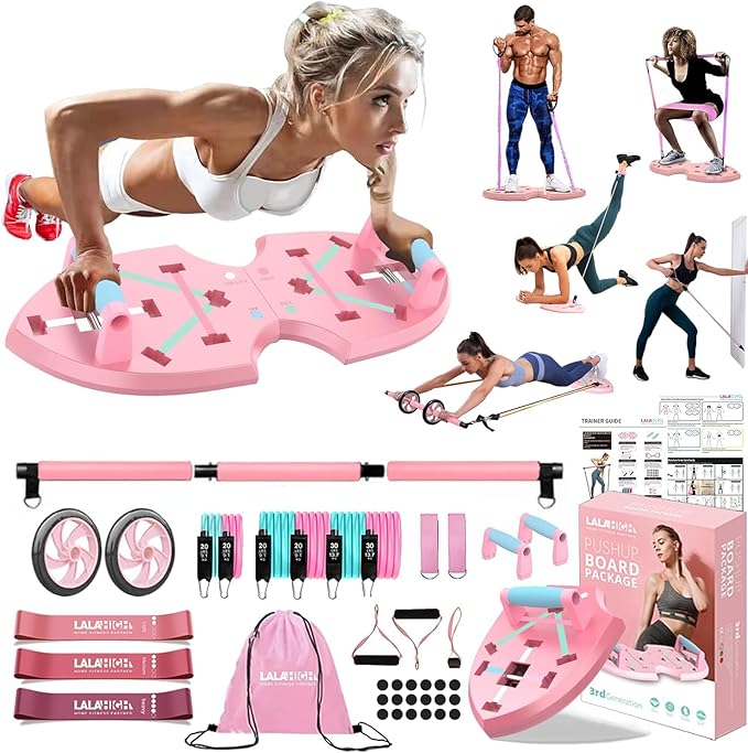 - All In One Home Gym System:In addition to the push-up board, this all-in-one portable workout equipment system includes a Pilates bar and 20 fitness accessories. These fitness accessories, such as resistance bands and an ab roller wheel, provide a wide range of exercises to target various muscle groups for a complete full body workout.