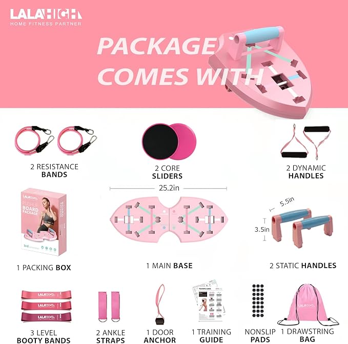 • All-In-One Home Gym System:LALAHIGH pink styled home workout equipment kit is perfect for women or men, comes with foldable push up stand, push up bar handles, resistance bands, booty bands, and core sliding discs.