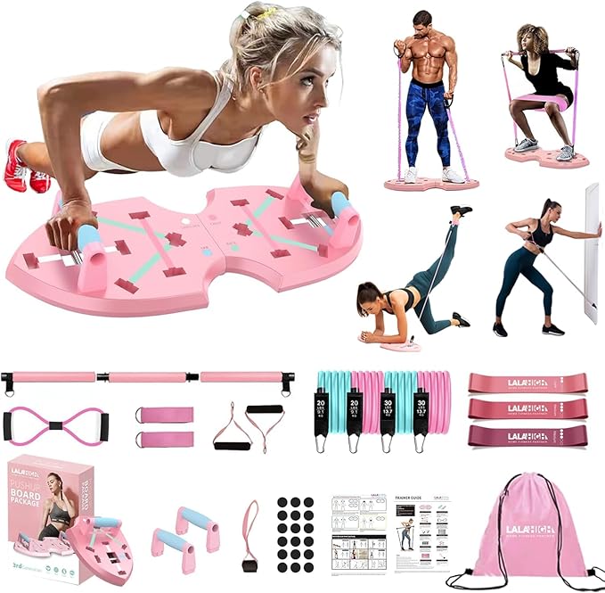 - Ultimate Home Gym:This pink styled at home workout equipment for women & men comes with a foldable pushup board, booty workout set, pilates bars, and resistance bands. This package provides a variety of home exercise that will help optimize your personal training, and let you progress naturally and safely with low-impact exercises.