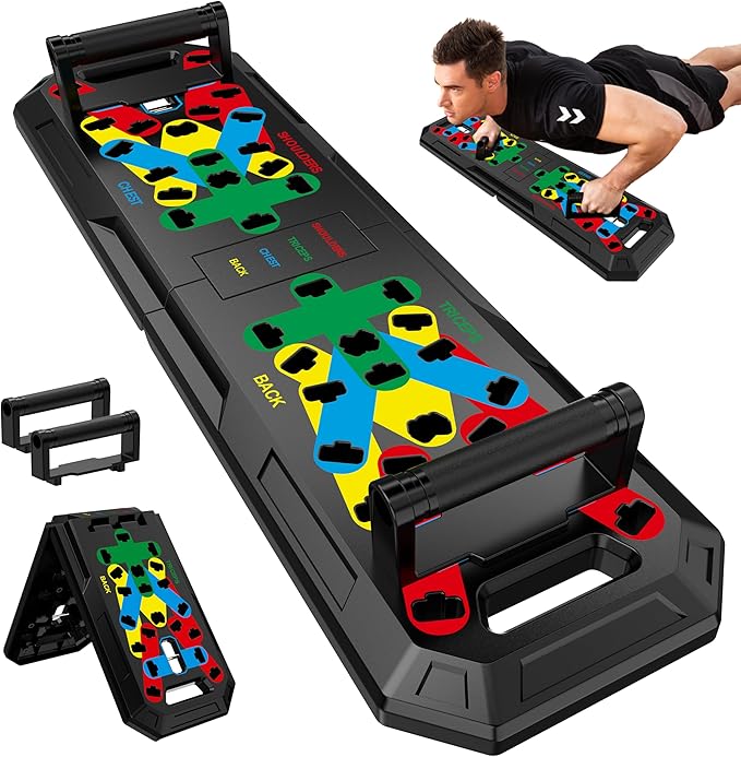 • Multi-functional: The multi-functional training board comes with an upgraded design and a color-coded guide. It targets different muscle groups (chest, shoulders, abs, biceps, back), allowing various combinations of positions to achieve more push-up angles.