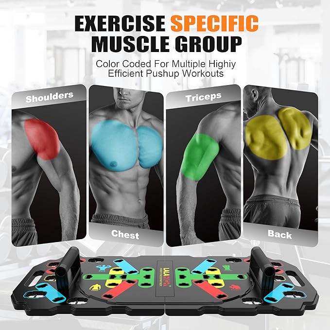 • BIGGER & STRONGER: Bigger foldable push up board can withstand tough workouts and provide long-lasting performance. It is designed for different muscle groups (back, chest, triceps, shoulders) and offers a wide range of mix and match color combination poses to make muscle training more professional and effective