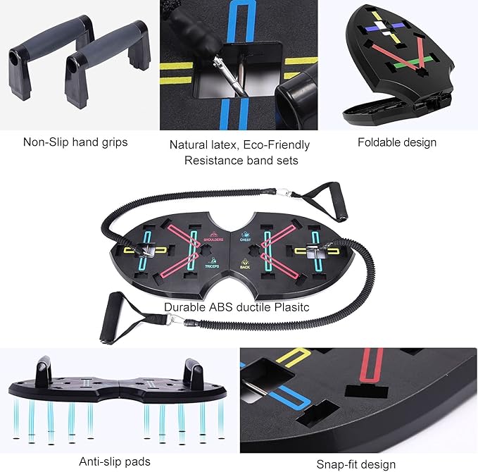• PREMIUM QUALITY:The push up board is made of ABS Ductile plastic that with strong toughness.. The resistance bands are made of natural latex that is long-lasting and eco-friendly. The non-slip push up handles provide a firm grip and distribute pressure evenly to reduce joint pressure. There are also added non-slip plugs to help stabilize your body while exercise.