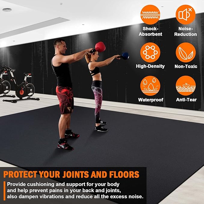 - ✅EXTRA-LARGE HOME GYM MAT COVERS 40 SQUARE FEET: The 8’x5’x7mm large fitness mat instantly transforms any space into a professional gym, giving you and your partners more than enough room to workout on without feeling cramped, and the floor mat is even shoe-friendly, whether you’re doing cardio, yoga, weightlift, dance workout including P90x, MMA, TAM, insanity, T25, Zumba, TRX, kettlebell, jumping rope or need large mats to install underneath a treadmill or weight bench, try this exercise mat.