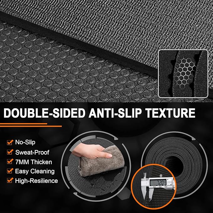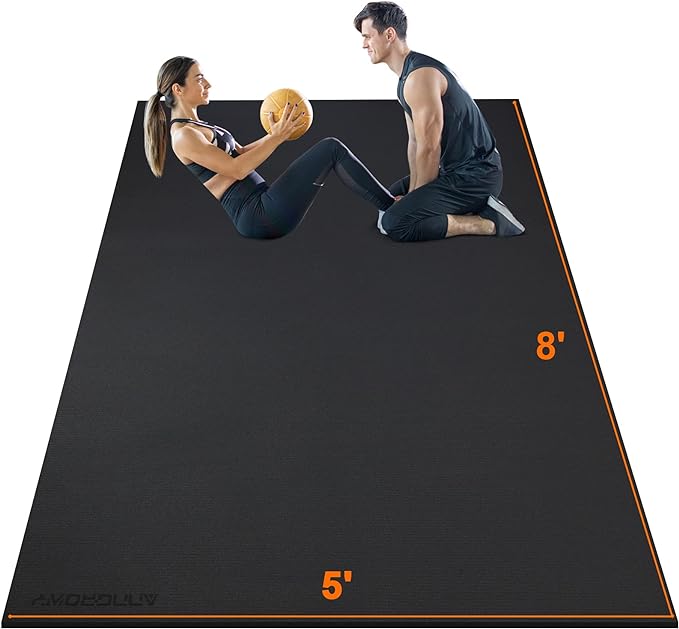 • ✅EXTRA-LARGE HOME GYM MAT COVERS 40 SQUARE FEET: The 8’x5’x7mm large fitness mat instantly transforms any space into a professional gym, giving you and your partners more than enough room to workout on without feeling cramped, and the floor mat is even shoe-friendly, whether you’re doing cardio, yoga, weightlift, dance workout including P90x, MMA, TAM, insanity, T25, Zumba, TRX, kettlebell, jumping rope or need large mats to install underneath a treadmill or weight bench, try this exercise mat.