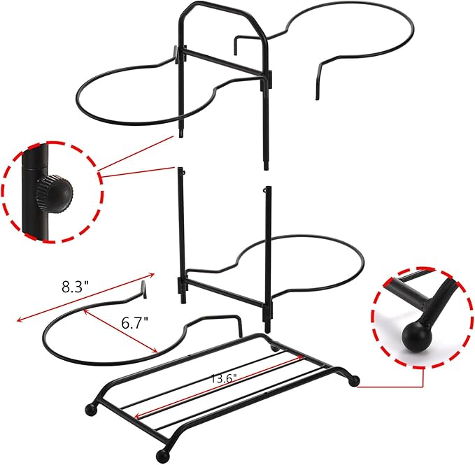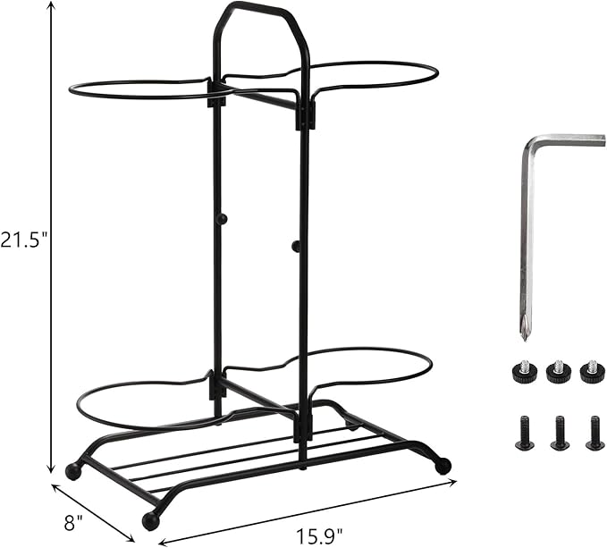 - Ball Rack Dimensions: The overall size of the ball storage rack is 16 L x 8W x 21.5H inches, and it comes in black. The double-layer double-sided basketball storage rack can hold 4 balls, such as basketballs, football, volleyball, etc., neatly in place. Keeps the ball all in one place instead of all over the yard and driveway.