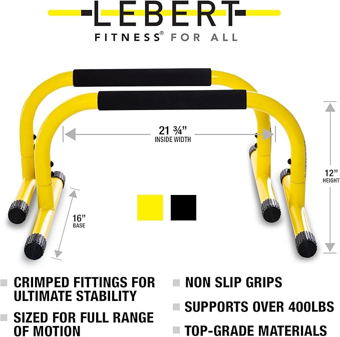• INCLUDES: Two (2) Yellow Lebert Parallettes Bars plus two downloadable PDF Workout Guides (Lebert Fitness Parallette Beginner Workout Guide and the Back to Basics Equalizer Workout Guide)