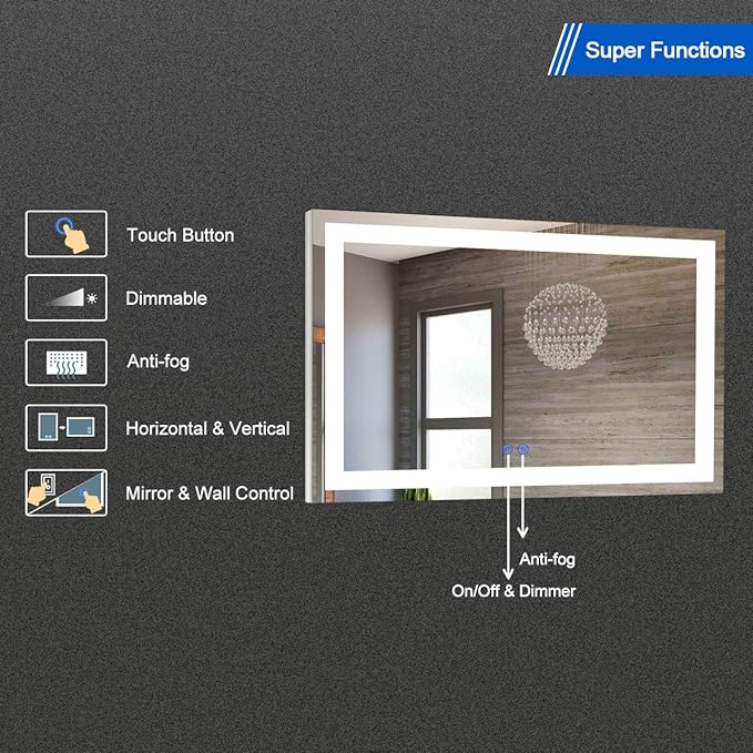 - 【Anti-Fog and Waterproof】The wall-mounted vanity mirror has an anti-fog function, it can automatically enter the anti-fog state with a flick of a switch, and can maintain a clear reflection image even after showering. Make your makeup look easier and clearer.
