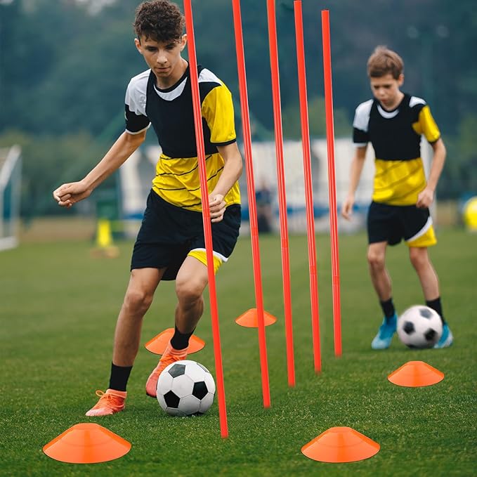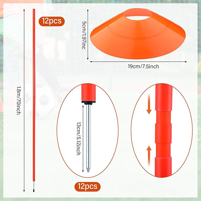 • Ample Quantity: this set includes 12 soccer training poles and 16 agility cones, providing enough equipment for a variety of training drills and exercises; With this set, athletes can create training programs that are tailored to their specific needs; The quantity makes it easy to set up multiple training stations, allowing for efficient use of time during training sessions; Whether you are an advanced athlete or a beginner, this set will help you improve your training goals in the short term