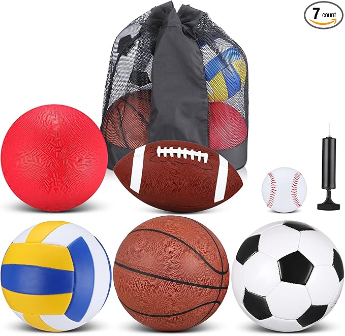 - 6 Ball Set: this sport ball set has all of your favorite sports covered! You will receive football, basketball, soccer ball, volleyball, playground ball, baseball, pump, and large capacity carry bag which can holds up to 6 balls; Grab your friend and play a game of sport balls