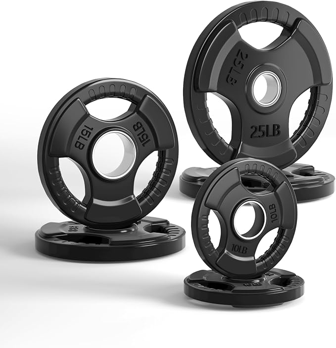 - Comfortable and Convenient: Each plate has 3 openings with strips on them for easy and secure grip when loading and unloading the weights. Labeled in LB for easy recognition.