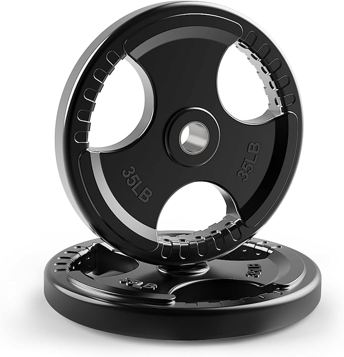 - Comfortable and Convenient: Each plate has 3 openings with strips on them for easy and secure grip when loading and unloading the weights. Labeled in LB for easy recognition.