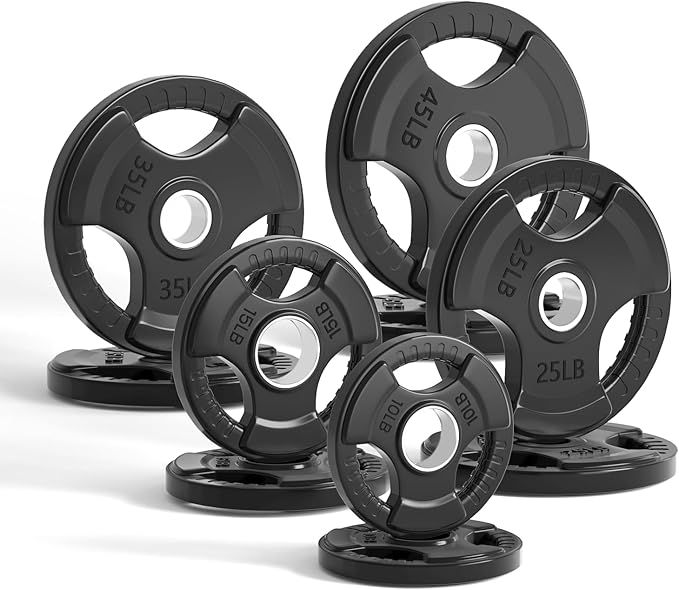 - Comfortable and Convenient: Each plate has 3 openings with strips on them for easy and secure grip when loading and unloading the weights. Labeled in LB for easy recognition.