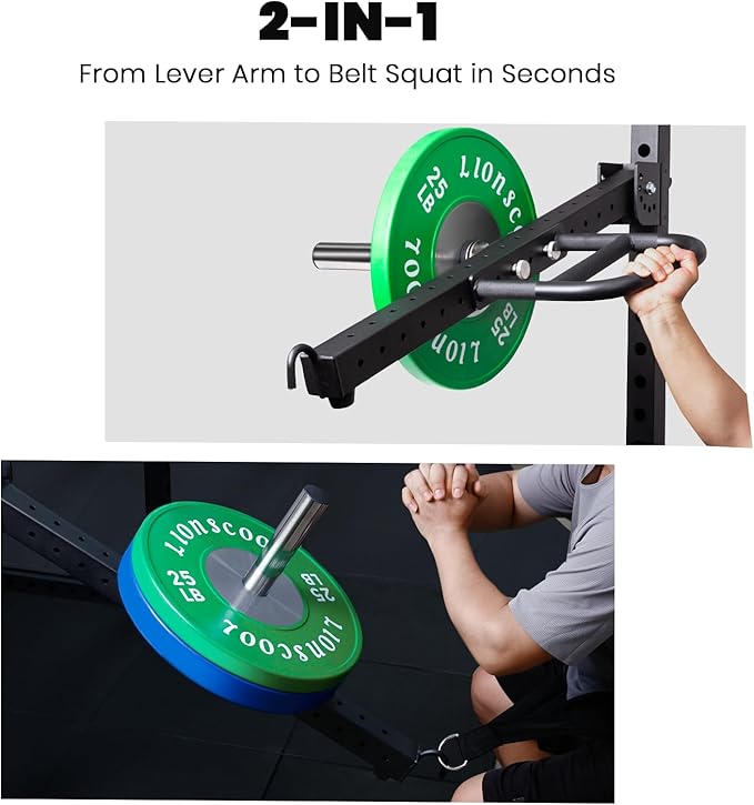 - Dual Function: Are you looking for a convenient and versatile power rack attachment to get high intensity workout in the comfort of your own home? Look no further than LIONSCOOL's Dual Function Lever Arm Belt Squat Attachment, which allow you to switch between upper body training and lower body training with ease. This dual-function attachment comes with two knurled knobs with quick attach design. You can effortlessly switch between the two ways of training in seconds.