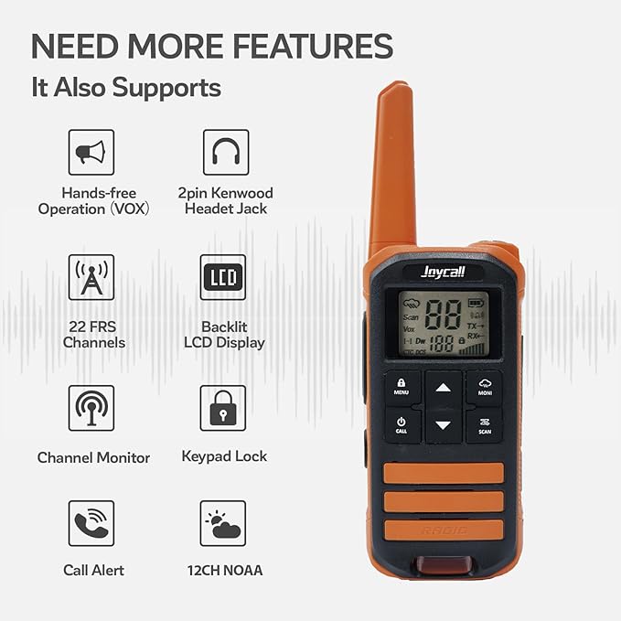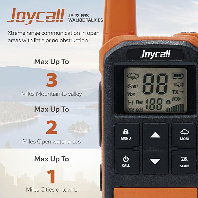 - (📡 Long Range Communication): Joycall two-way radios offer up to 5km range in open areas like plains and coastal regions, with no license required. VOX functionality allows hands-free use, making it perfect for users of all ages.