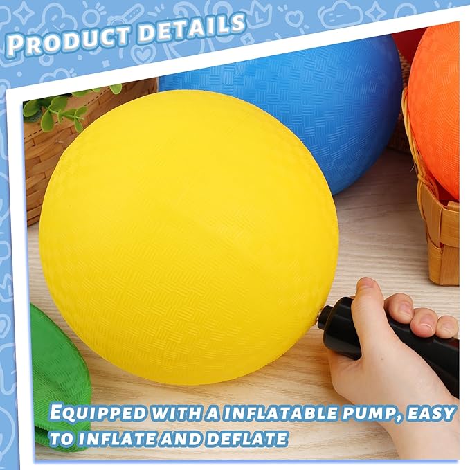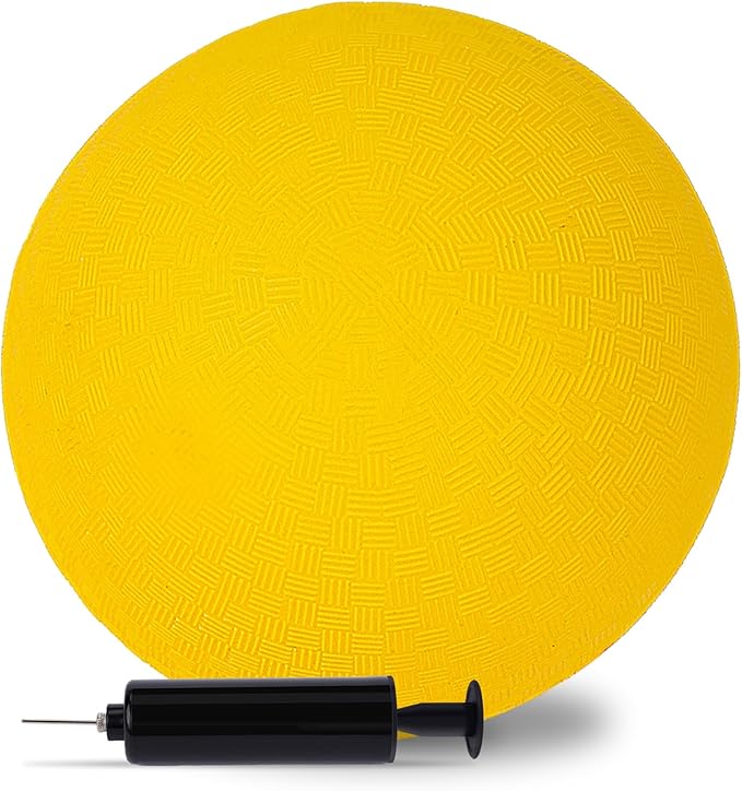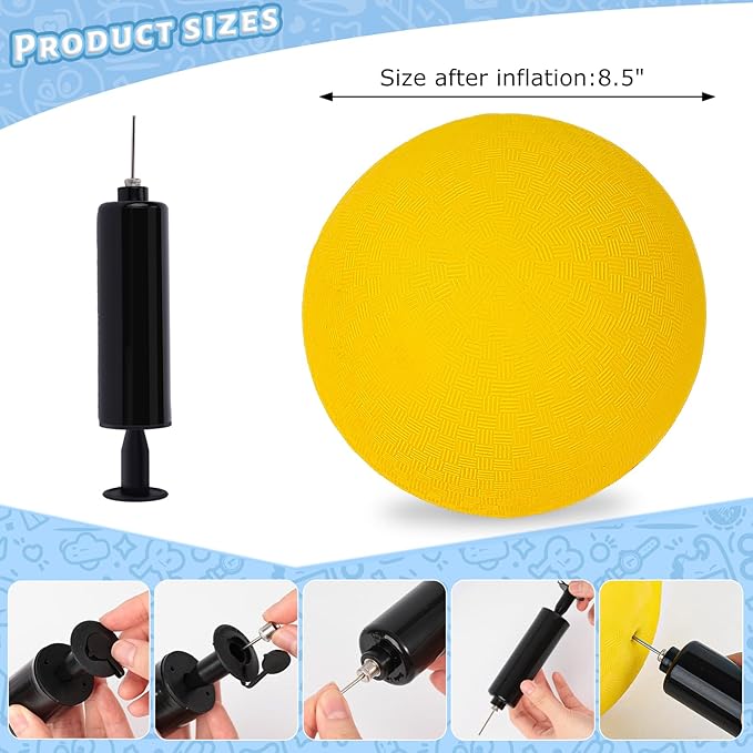 - Package Include: The ball set includes 1 yellow playground ball and 1 air pump (Hide in Inflatable handle). The ball has an 8.5inch diameter after inflating, featuring textured no-slip grip, bright and vibrant.