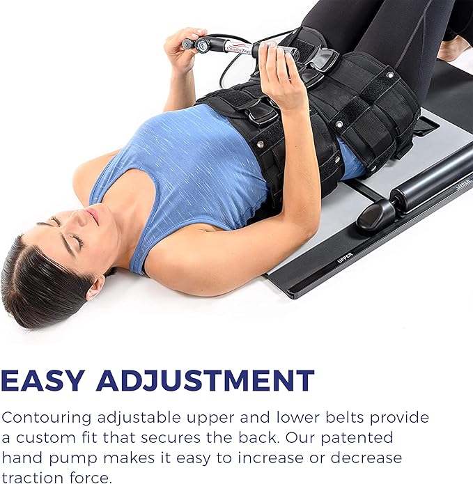 - EASY TO ADJUST. This patented product comes with contouring adjustable upper and lower belts for a custom fit that secures the back while providing lumbar traction.
