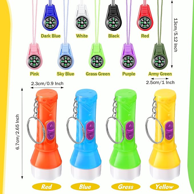 - Multiple Color Choices: the mini compass survival has 9 colors, including black, white, army green, grass green, pink, purple, sky blue, dark blue and red color, the mini flashlight keychain has 4 colors, including red, yellow, blue and green color, a variety of colors to meet your diverse demands