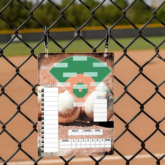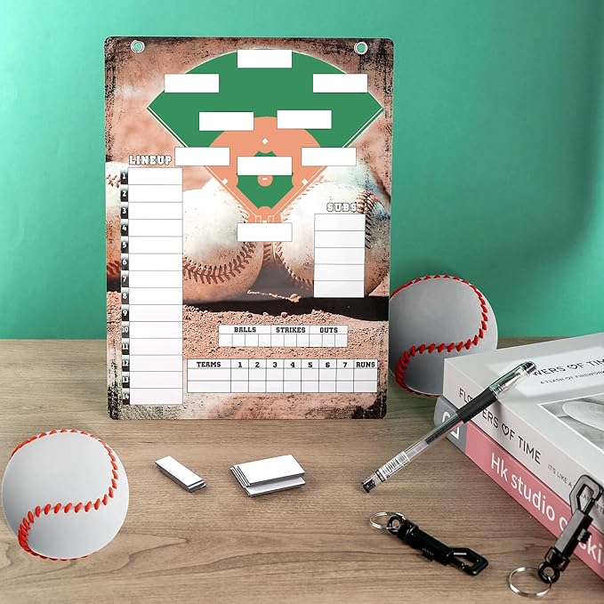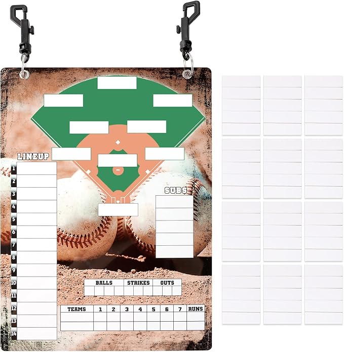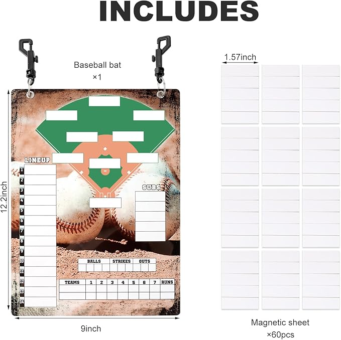 - Package Includes: Each set of magnetic baseball coaching accessories comes with 1 tactical coaching board, 60 magnetic lineup cards, and 2 hooks. Our baseball lineup board measures 12.4 x 9.1 inches, and the magnetic name strips are 1.65 x 0.51 inches each.