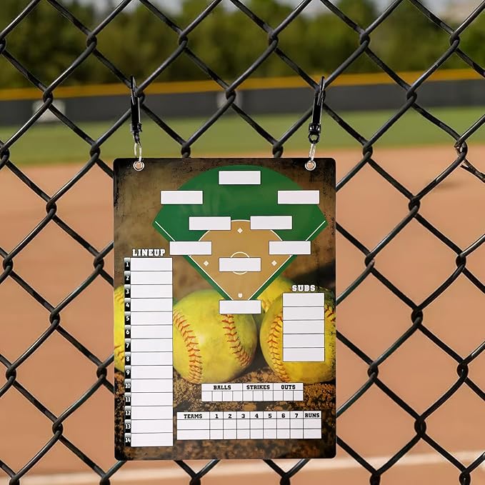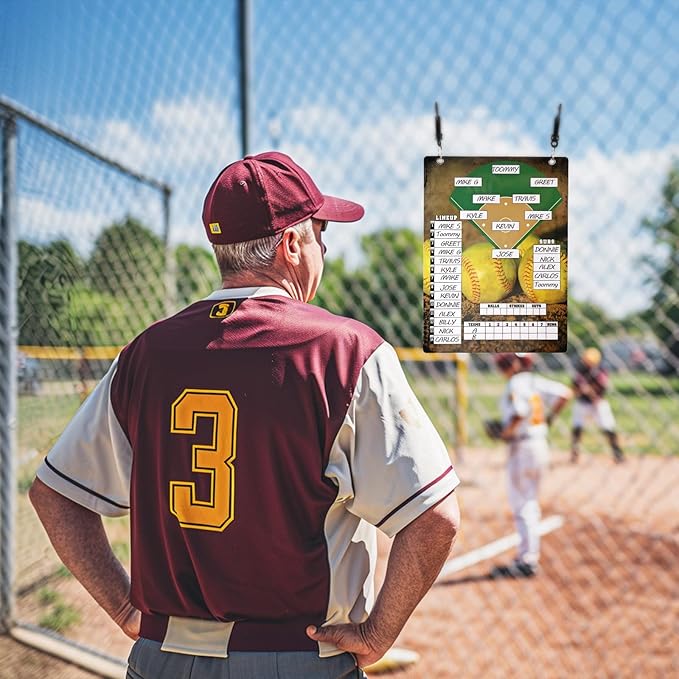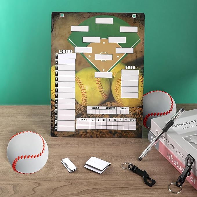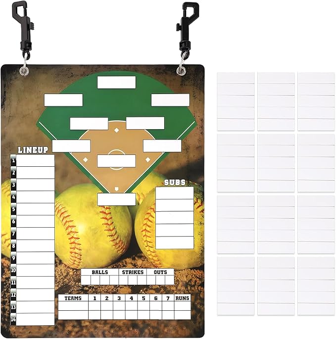 • Package Includes: Each set of magnetic baseball coaching accessories comes with 1 tactical coaching board, 60 magnetic lineup cards, and 2 hooks. Our baseball lineup board measures 12.4 x 9.1 inches, and the magnetic name strips are 1.65 x 0.51 inches each.