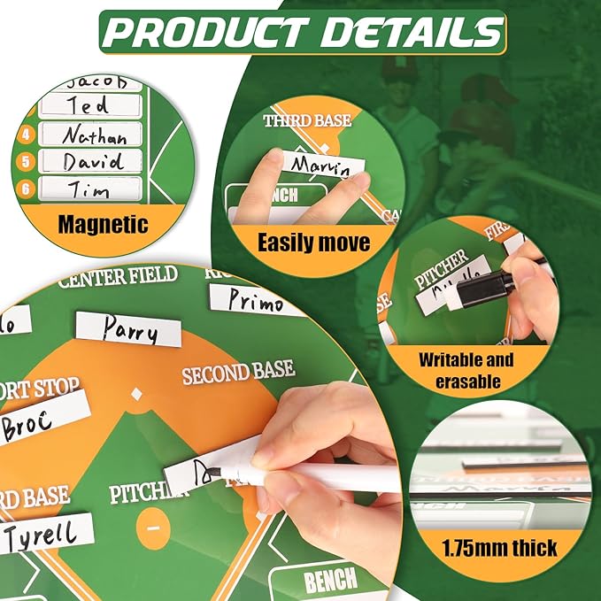 - PACKAGE LIST: Each set of magnetic baseball coaching accessories includes 1 tactical coaching board, 40 magnetic lineup cards, 1 black dry wiping pen and 1 red dry wiping pen, and 2 pieces of hooks,Our baseball lineup board measures 12.6 x 11 inches, the magnetic name strip is 1.97 x 0.43 inches.