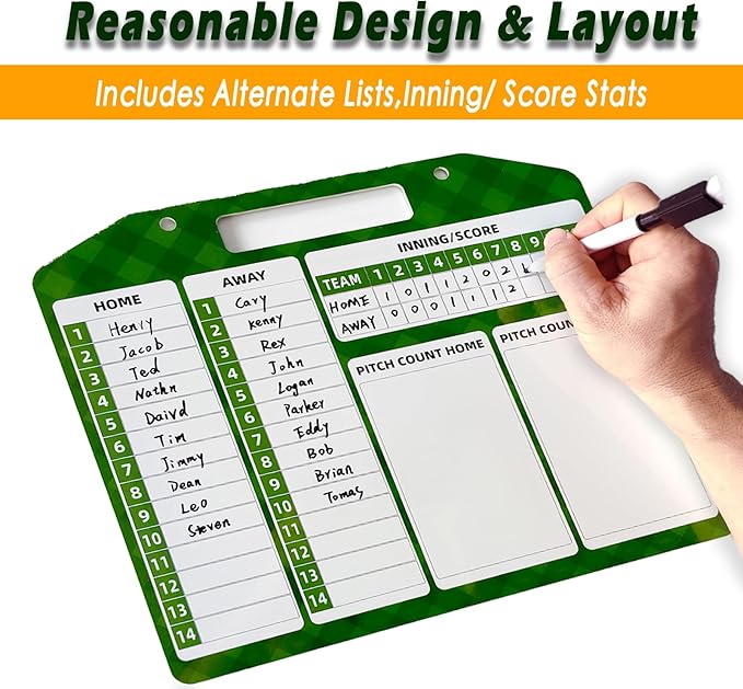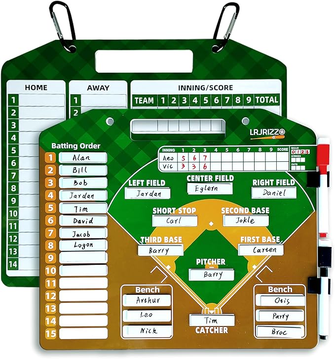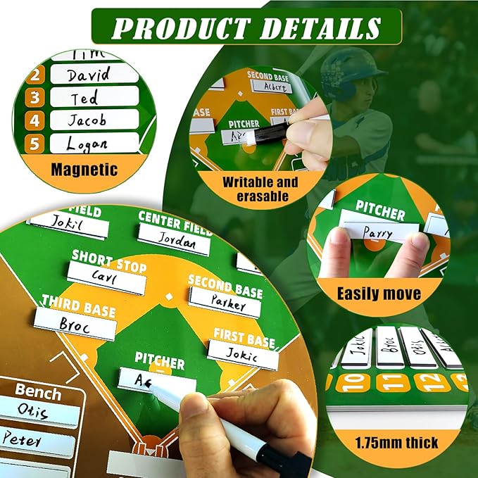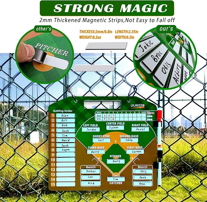 - ⚾ 【Record the Score, Practical Baseball Coaching Accessories】magnetic baseball lineup board double-sided use,baseball whiteboard the front can be decorated with lineup tactics, baseball dry erase coaching board can record the score of the game to avoid forgetting.lineup cards for softball can also record the situation of the game, baseball magnetic lineup board baseball coach clipboard baseball dry erase board baseball dugout board.