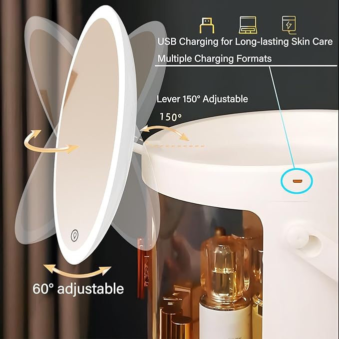 - 【Dual LED Lights】: Both the make-up mirror and the organizer come with LED lights. The make-up mirror can adjust the angle to achieve 3D three-dimensional complementary light, warm yellow, cold white, normal three colors, can meet the needs of different scenes. The light of the make-up cabinet can make it easier for you to find items in the dark night.
