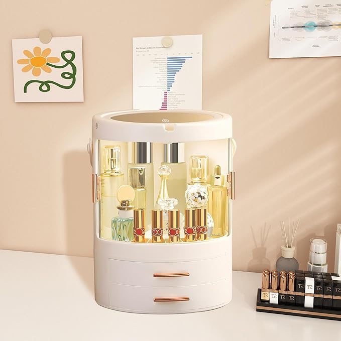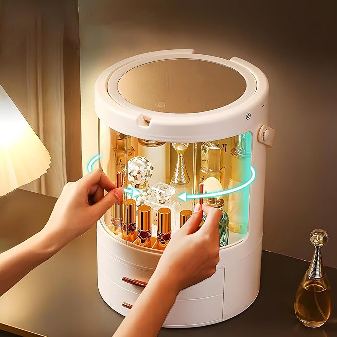- 【Large capacity】: The rotating makeup organizer can achieve large capacity partition storage. The upper space can store skin care products, and the chassis can be rotated 360°, making it more convenient to store and take. The bottom layer with two drawers can store hand accessories.