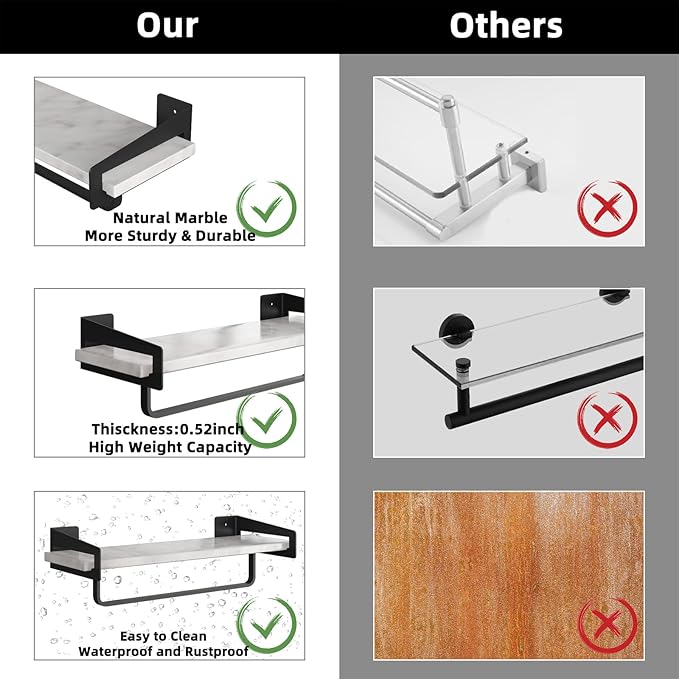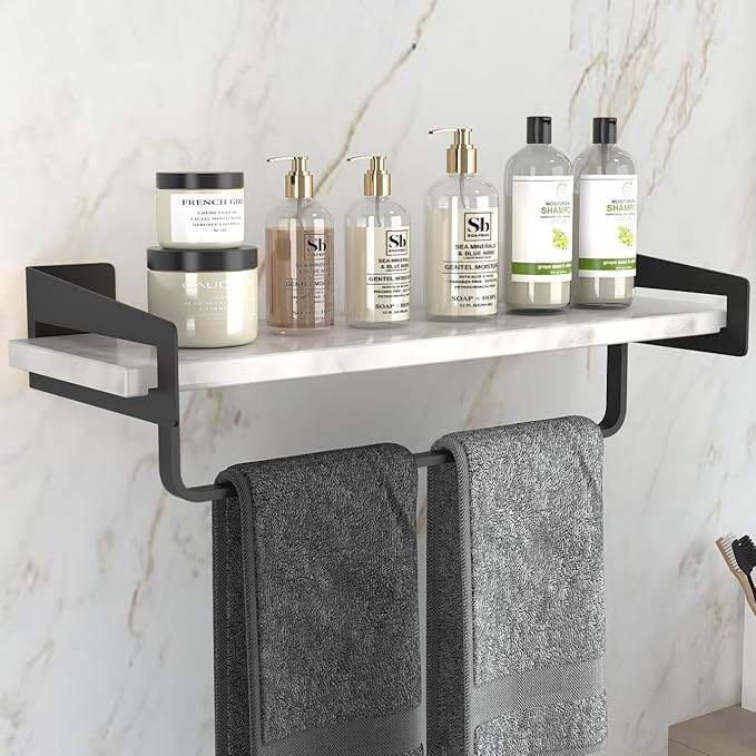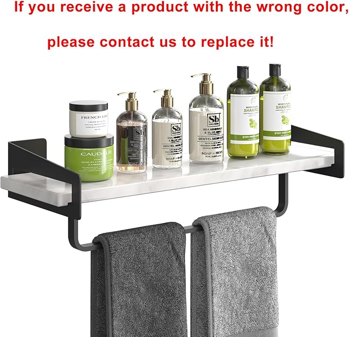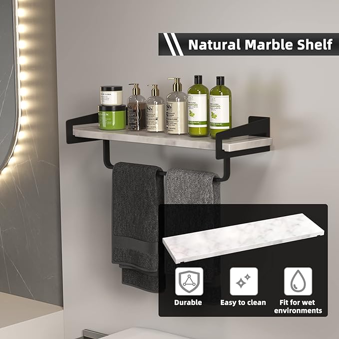 - Modern Design:The bathroom wall shelf and the towel bar are all-in-one and Bottom of marble slab card slot non-slip design.The white marble surface has a unique texture,paired with metal shelf,suitable for various decoration style